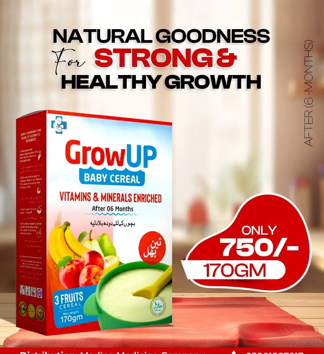 GrowUP Baby Cereal is enriched with essential Vitamins & Minerals for strong & healthy growth after 6 months.